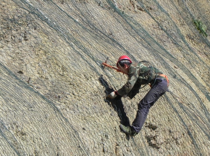 主動(dòng)防護(hù)系統(tǒng)是以鋼絲繩網(wǎng)為主的各類柔性網(wǎng)覆蓋包裹在所需防護(hù)斜坡或巖石上,以限制坡面巖石土體的風(fēng)化剝落或破壞以及為巖崩塌(加固作用),或?qū)⒙涫刂朴谝欢ǚ秶鷥?nèi)運(yùn)動(dòng)(圍護(hù)作用)。