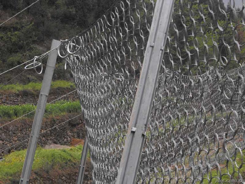 材質(zhì):鋼絲繩網(wǎng)、支撐繩和減壓環(huán)構(gòu)造:由鋼絲繩網(wǎng)或環(huán)形網(wǎng)(需攔截小塊落石時(shí)附加一層鐵絲格柵)、固定系統(tǒng)(錨桿、攔錨繩、基座和支撐繩)、減壓環(huán)和鋼柱四個(gè)主要部分構(gòu)成。