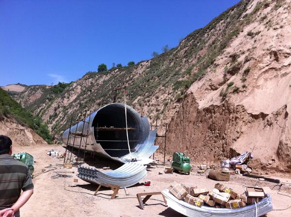 當(dāng)利用推土機(jī)和其它重型設(shè)備修筑路其和排水溝時(shí),埋設(shè)金屬波紋管涵的挖土、金屬波紋管涵埋設(shè)后的回填土和由涵洞出口把水導(dǎo)出去的泄水溝的挖掘等,一般來(lái)說(shuō)是采用機(jī)械化作業(yè)的。為了給圓形管拱或拱起金屬波紋管涵而準(zhǔn)備好一個(gè)平滑床,要鋪上一層厚度10厘米左右的粗砂層或礫石層,該層的材料要求松散些以便金屬波紋管涵能夠埋沒(méi)于該層中。該平滑床應(yīng)具有3-5%連續(xù)坡度,支承金屬波紋管涵管道全長(zhǎng)�;靥钔翍�(yīng)按6英寸一層給予壓實(shí)以加固對(duì)涵洞的側(cè)向支持力。這件事用手提式振動(dòng)壓實(shí)器是可以輕而易舉地做到的。在涵洞上面鋪蓋的土層百度取決于所使用的涵洞材料的厚度,土壤特性,車輛軸重和行駛速度。在生產(chǎn)上推薦的是用承載能力強(qiáng)的土并把它壓實(shí)到等于金屬波紋管涵直徑的厚度。