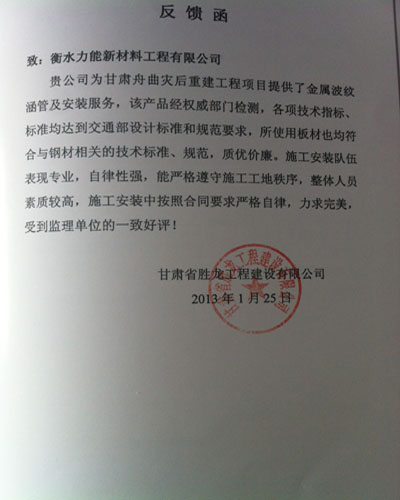貴公司為甘肅舟曲災(zāi)后重建工程項(xiàng)目提供了金屬波紋涵管及安裝服務(wù),該產(chǎn)品經(jīng)權(quán)威部門檢測,各項(xiàng)技術(shù)指標(biāo),標(biāo)準(zhǔn)均達(dá)到交通部設(shè)計(jì)標(biāo)準(zhǔn)和規(guī)范要求,所使用板材也均符合與鋼材相關(guān)的技術(shù)標(biāo)準(zhǔn),規(guī)范,質(zhì)優(yōu)價廉。施工安裝隊(duì)伍表現(xiàn)專業(yè),自律性強(qiáng),能嚴(yán)格遵守施工工地程序,整體人員素質(zhì)較高,施工安裝中按照合同要求嚴(yán)格自律,力求完美,受到監(jiān)理單位的一直好評!